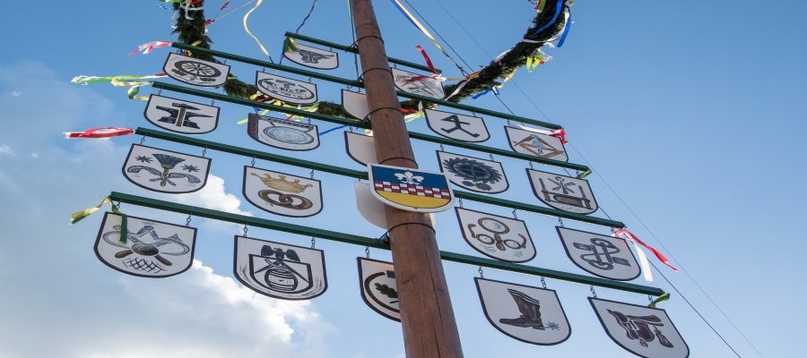 Der Breckerfelder Maibaum trägt Handwerkerwappen, der Berufe, die in Breckerfeld früher ausgeübt wurden bzw. noch heute ausgeübt werden.